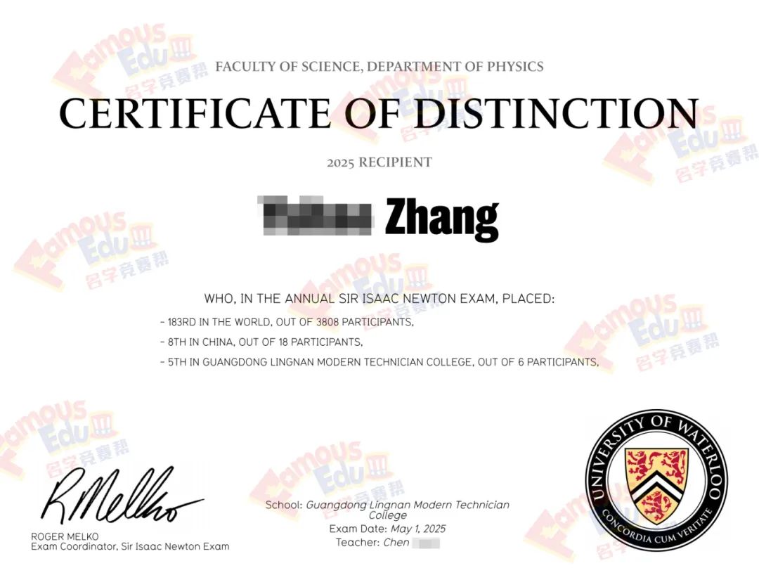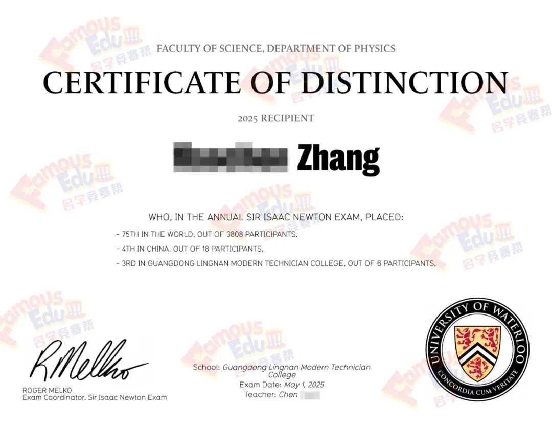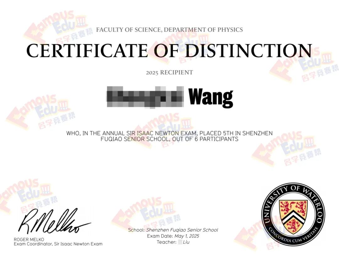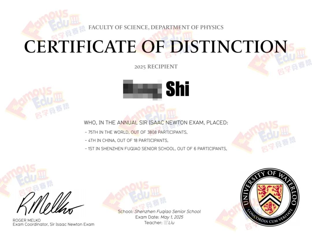 SIN考试的获奖证明被全球排名前200的大学高度认可,获奖者有很大机会获得滑铁卢大学物理系发放的丰厚奖学金。